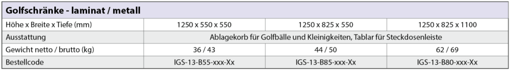 Golfschränke werden für die sichere Aufbewahrung von Golf-Trolleys und anderer Golfausrüstung verwendet. An der Seite des Schranks befindet sich eine Ablage zur Aufbewahrung einer Steckdosenleiste oder eines Ladegeräts. Eine Öffnung auf der Rückseite ermöglicht eine einfache Verkabelung im Schrank.