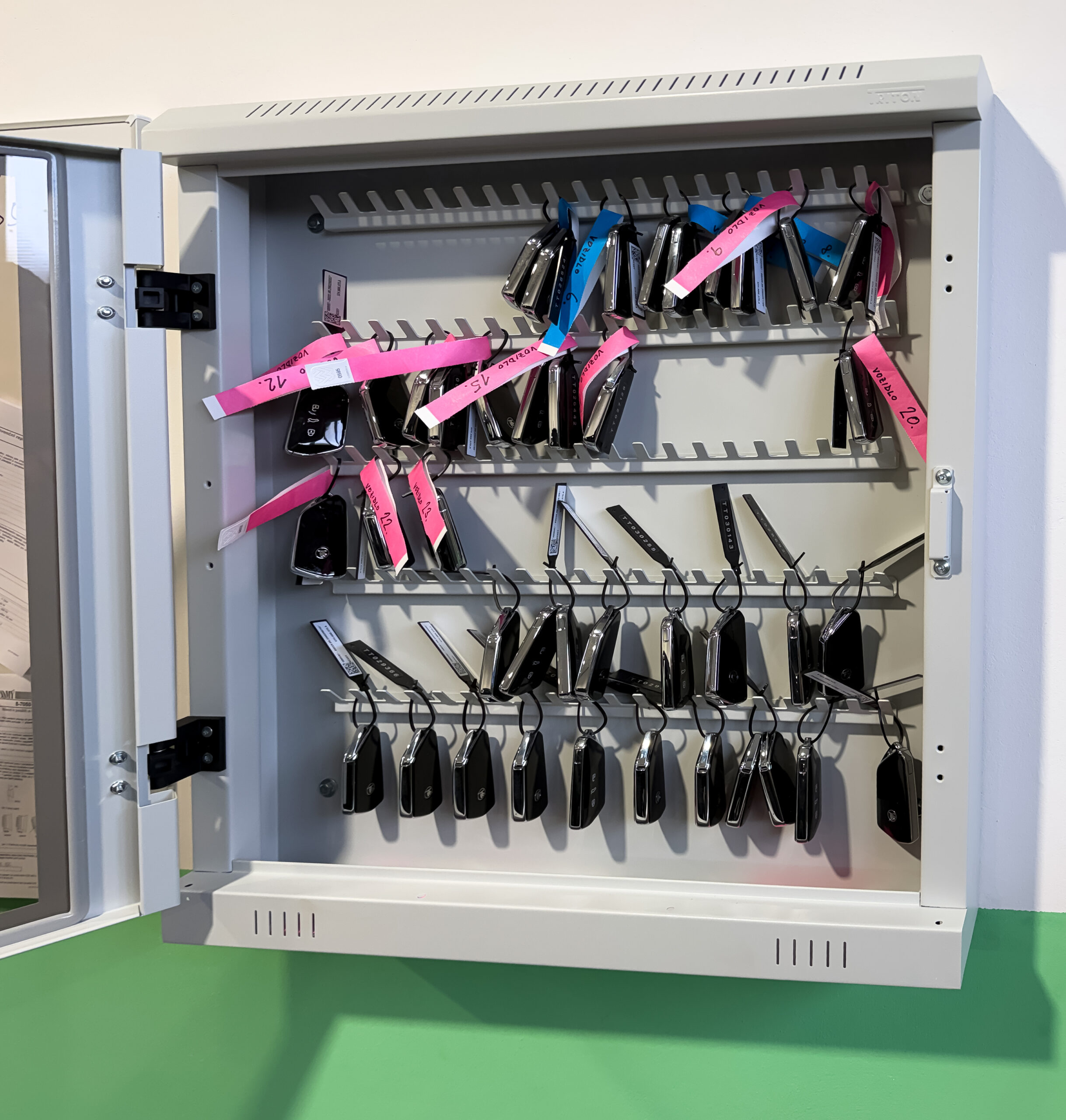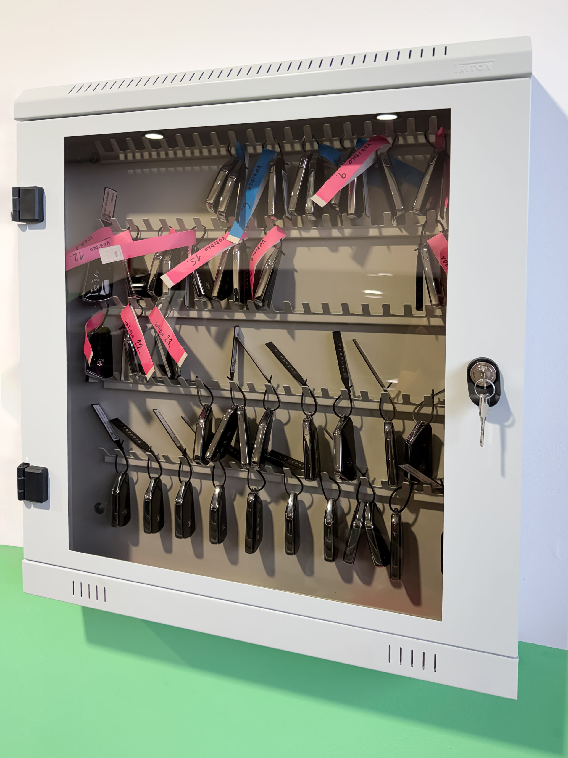 Der Schlüsselschrank aus Metall dient zur besseren Übersicht über die Schlüssel, z. B. bei der Hausverwaltung oder in Räumen, die mit einer größeren Anzahl an Garderobenschränken ausgestattet sind. Sie werden in den Grundfarben RAL 7035 (Lichtgrau), RAL 5005 (Blau) und RAL 9005 (Schwarz) hergestellt.