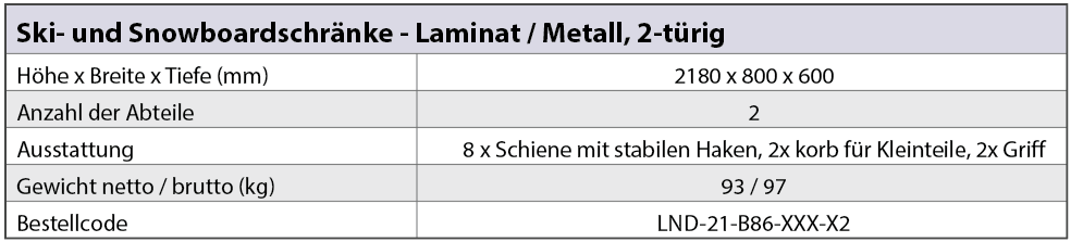 Die Ski- und Snowboardschränke, die mit zusätzlichem Zubehör ausgerüstet werden können, sind zur Ausstattung der Skiräume in Hotels, Pensionen und Skidepots in Wintersportgebieten bestimmt. Sie werden aus verzinktem Stahlblech hergestellt und die Türen sind aus laminierter Spanplatte mit 2 mm ABS-Kante gefertigt.