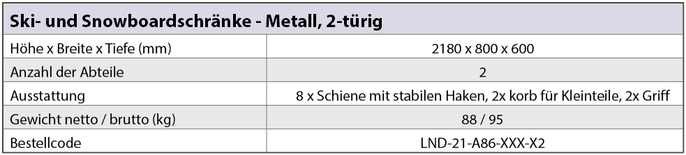 Die Ski- und Snowboardschränke, die mit zusätzlichem Zubehör ausgerüstet werden können, sind zur Ausstattung der Skiräume in Hotels, Pensionen und Skidepots in Wintersportgebieten bestimmt. Sie werden aus verzinktem Stahlblech hergestellt und in den Grundfarben RAL 7035 (Lichtgrau), RAL 5005 (Blau) und RAL 9005 (Schwarz) pulverlackiert.